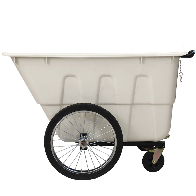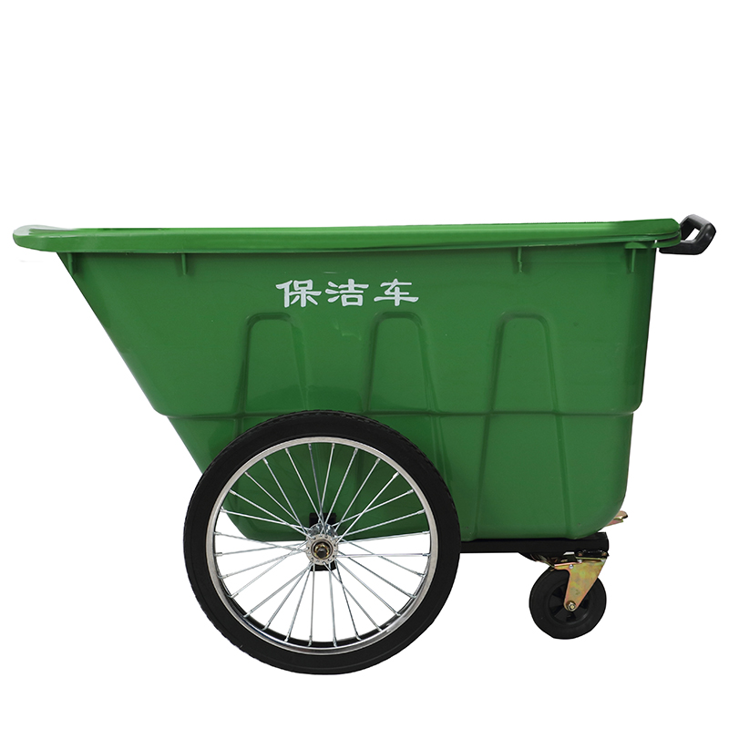 Mobility is another standout feature of this trash can, designed to navigate the diverse terrains of outdoor environments with ease. The rear large-diameter inflatable rubber wheels (12 inches in size) are engineered to tackle rough terrain, offering superior traction and shock absorption over uneven roads, gravel paths, potholes, and curbs that would halt smaller or less robust wheels. The inflatable design cushions the load, reducing vibration and ensuring a smooth ride even when transporting heavy waste over bumpy surfaces. Up front, the universal swivel wheels deliver 360-degree maneuverability, allowing operators to navigate tight corners, crowded pedestrian zones, narrow alleys, and confined spaces with minimal effort. This combination of rugged rear wheels and agile front wheels creates a labor-saving movement that reduces physical strain on workers, minimizing the risk of muscle fatigue, back injuries, and other work-related ailments during prolonged shifts. The ergonomically designed push handles, positioned at a comfortable height, further enhance usability by providing a secure grip and reducing wrist strain.